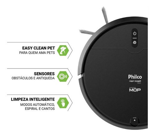 Aspira tapetes com perfeição. | Possui sensor de obstáculos e anti-quedas. | A bateria dura 1.5 h e é recarregada em 4 h. | Capacidade do reservatório de pó: 400 mL. | Sua potência é de 35 W.