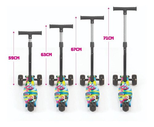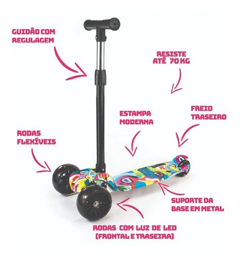 Material da patinete: metal. | Altura máxima do guidão: 71 cm. | Guidão ajustável. | É dobrável. | Possui luzes LED. | • Freio traseiro | • Recomendado para crianças a partir de 3 anos;